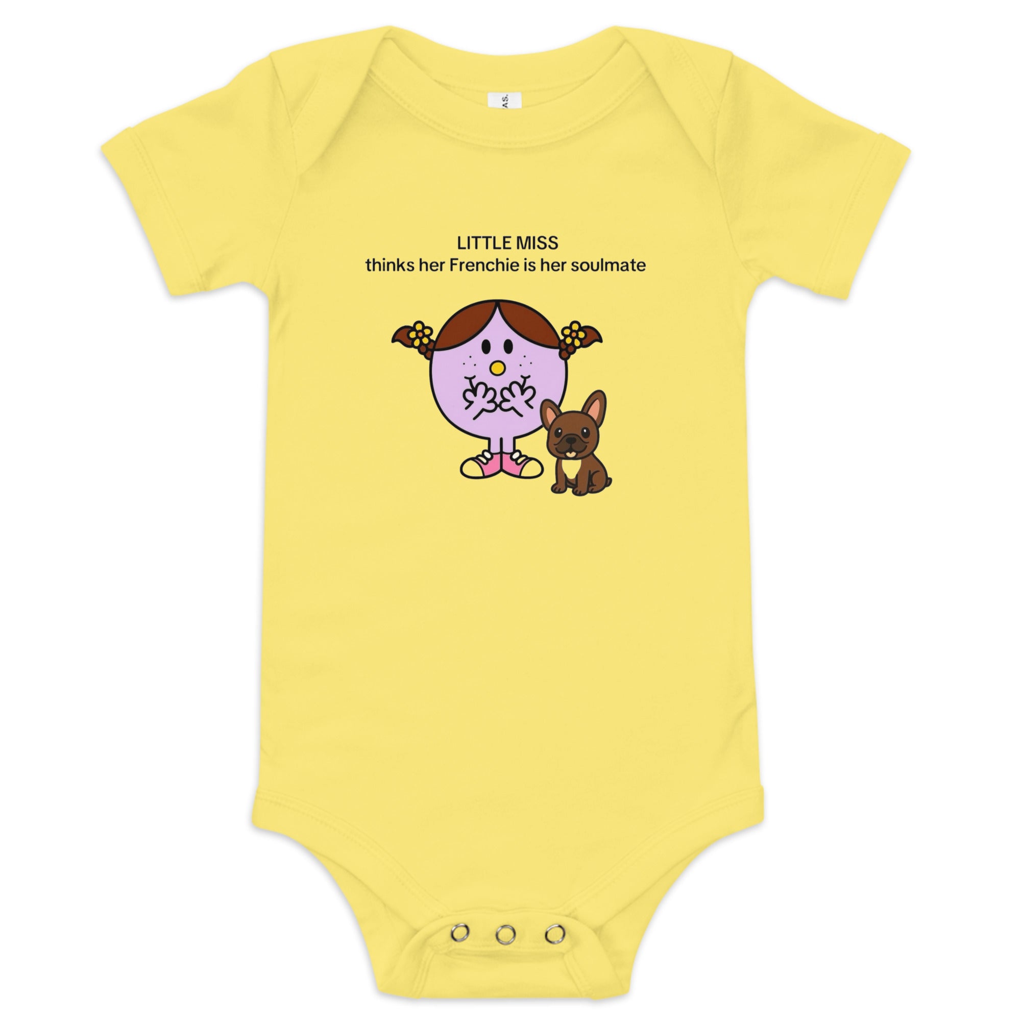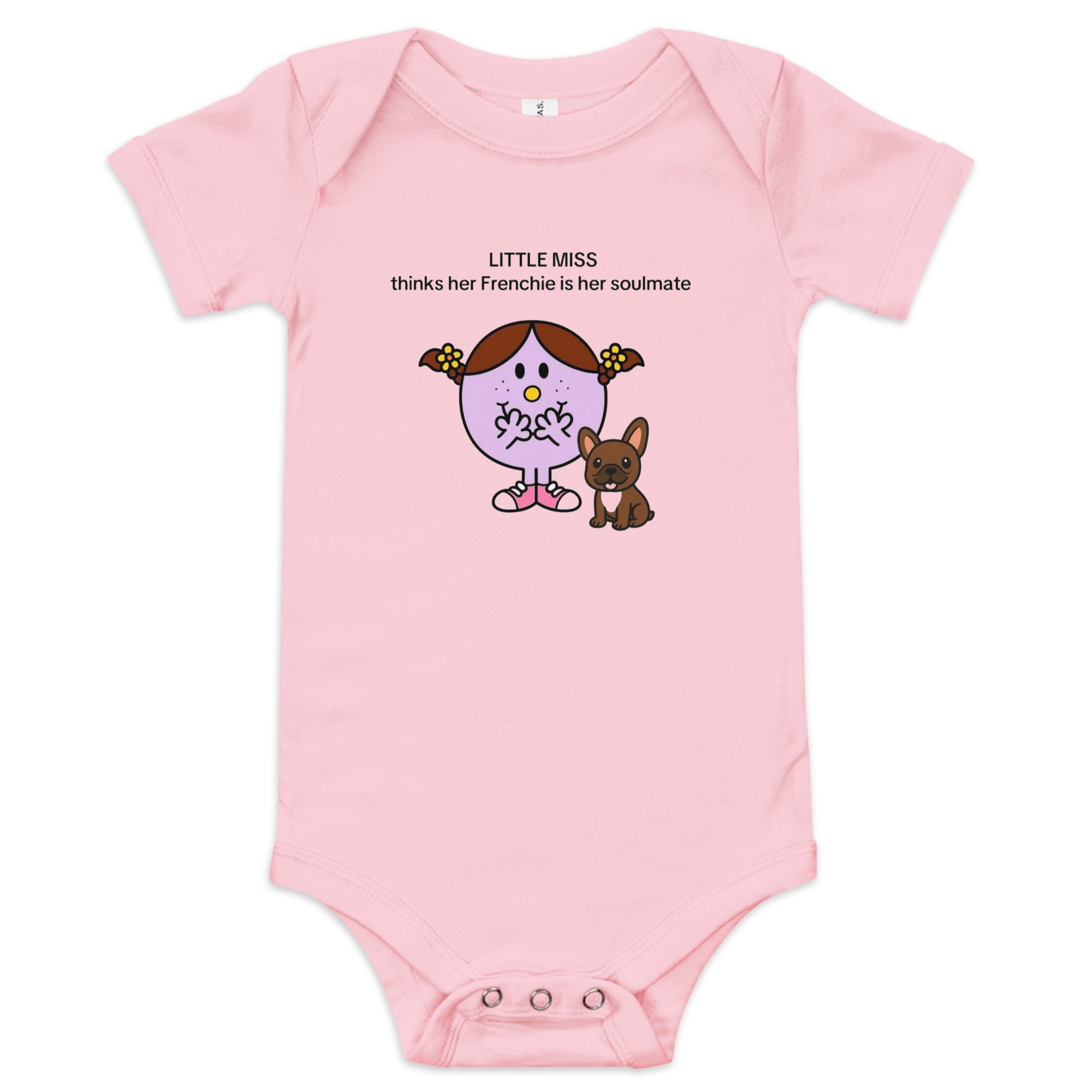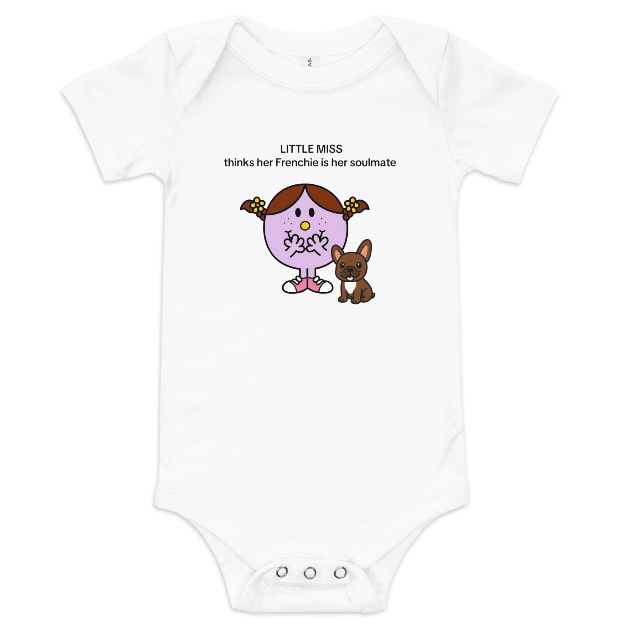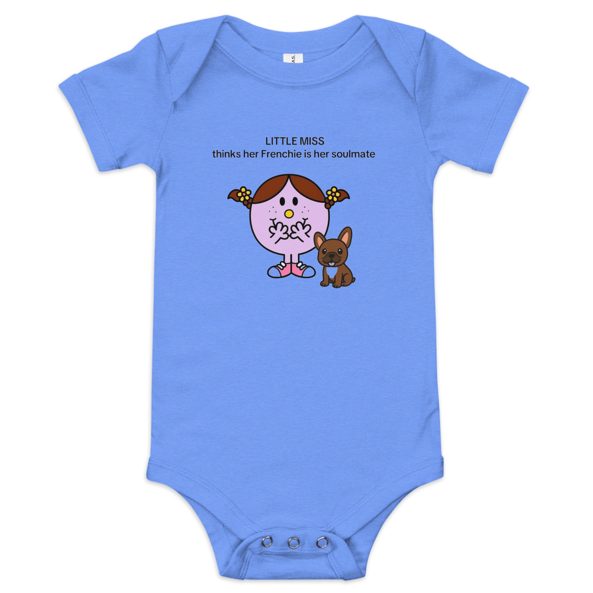 Dress your baby to the nines with this 100% cotton Little Miss Frenchie thinks her Frenchie is her soulmate baby onesie. It has three snap leg closure for easy changing, a comfortable envelope neckline, and a beautiful print that's bound to get the baby all happy and giggling.