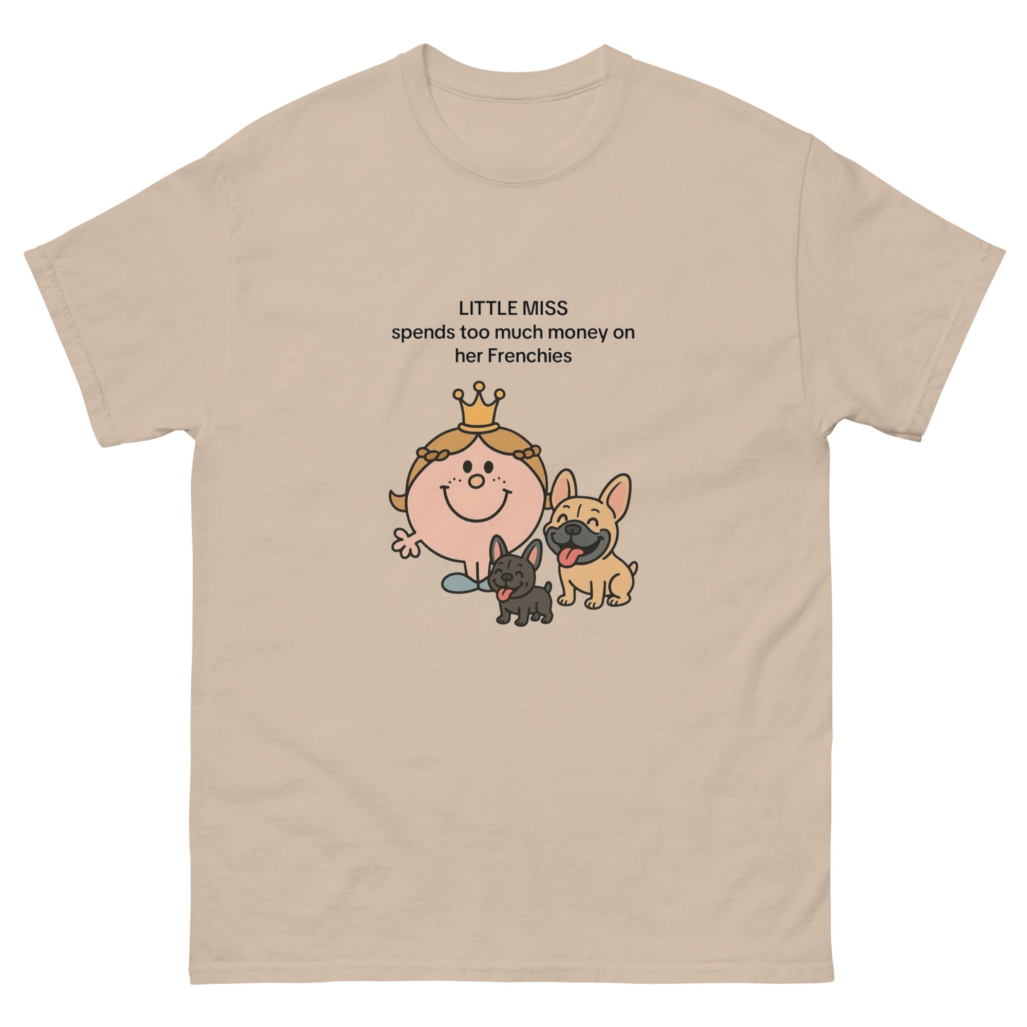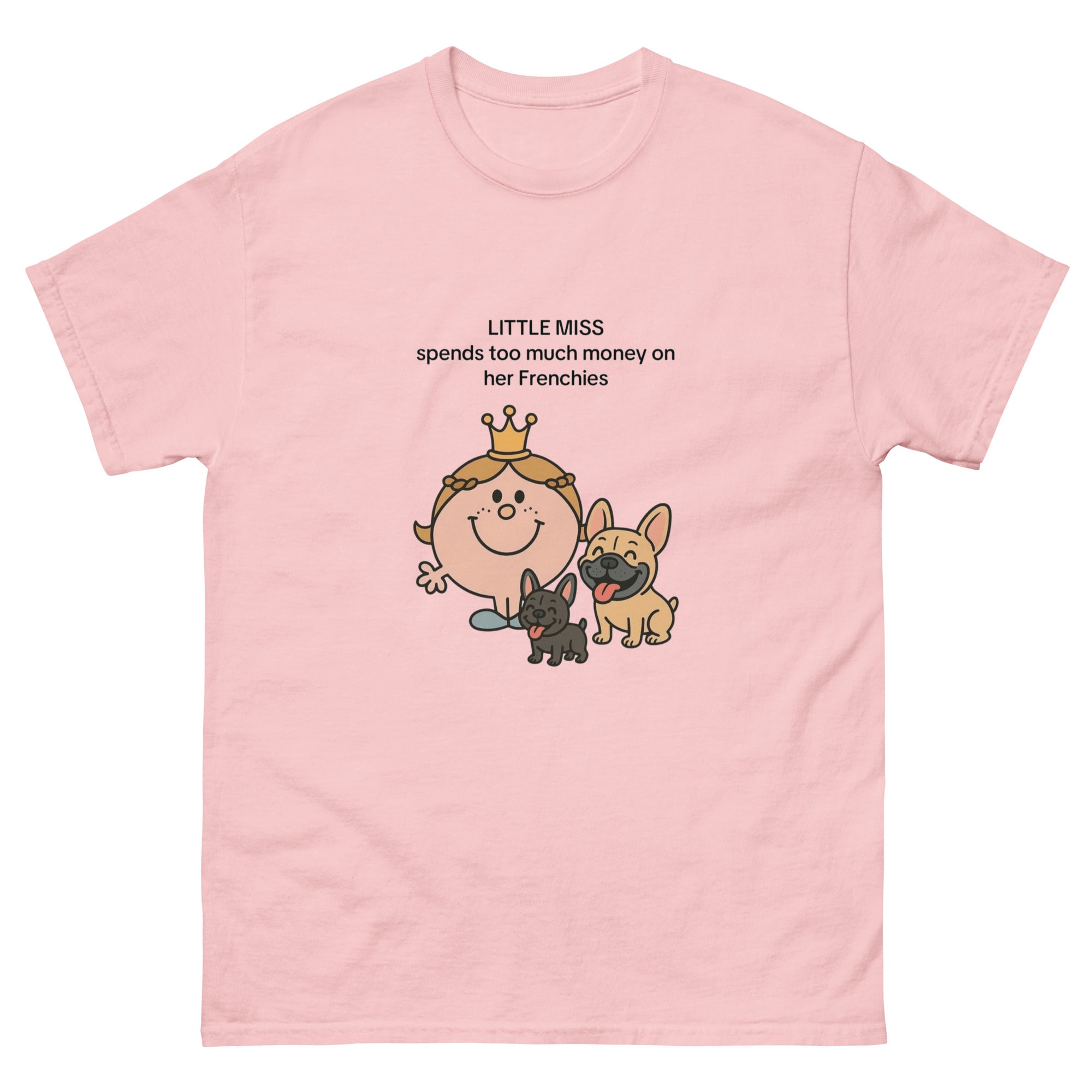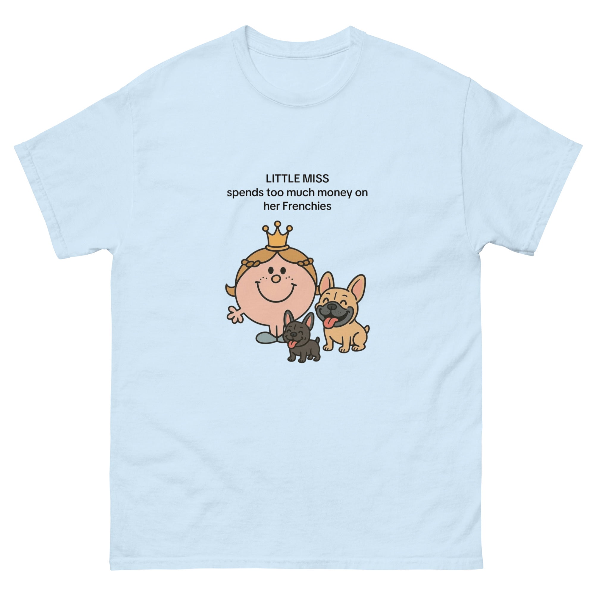 The 100% cotton Little Miss spends to much on her Frenchies t-shirt will help you land a more structured look. It sits nicely, maintains sharp lines around the edges, and goes perfectly with layered streetwear outfits. Plus, it's extra trendy now!